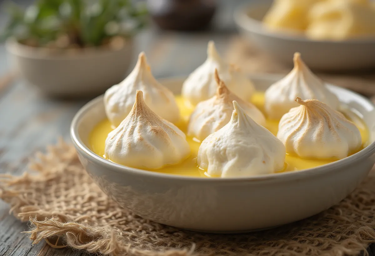 헝가리의 일요일을 상징하는 디저트로, 사실 프랑스의 '떠 있는 섬'(Île flottante)의 친척입니다. 핵심은 대조에 있습니다. 바닐라 향의 부드러운 잉글리시 크림(커스터드)과 그 위에 떠 있는 구름 같은 달걀 흰자 만두의 만남입니다.